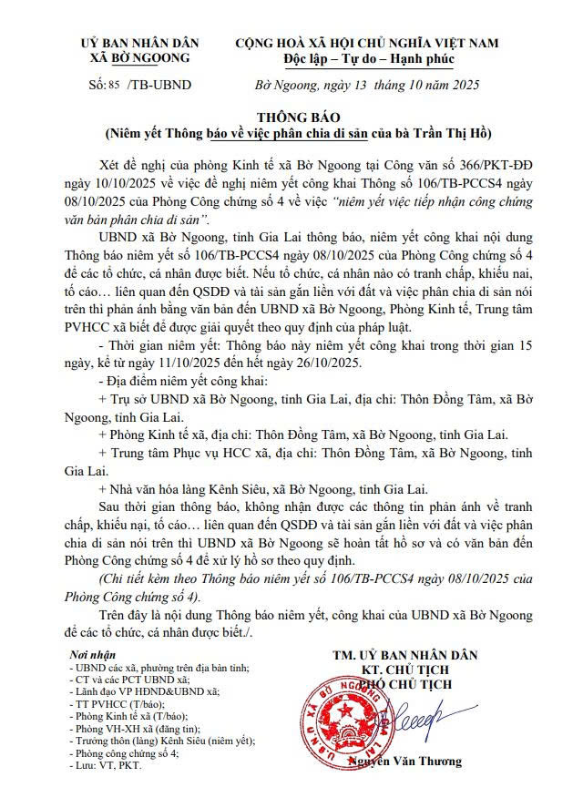 UBND xã Bờ Ngoong, tỉnh Gia Lai thông báo, niêm yết công khai nội dung Thông báo niêm yết số 106/TB-PCCS4 ngày 08/10/2025 của Phòng Công chứng số 4 để các tổ chức, cá nhân được biết. Nếu tổ chức, cá nhân nào có tranh chấp, khiếu nai, tố cáo… liên quan đến QSDĐ và tài sản gắn liền với đất và việc phân chia di sản nói trên thì phản ánh bằng văn bản đến UBND xã Bờ Ngoong, Phòng Kinh tế, Trung tâm PVHCC xã biết để được giải quyết theo quy định của pháp luật.