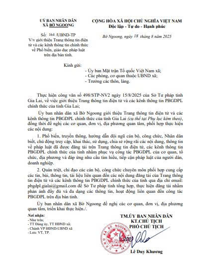 Ủy ban nhân dân xã Bờ Ngoong giới thiệu Trang thông tin điện tử và các kênh thông tin PBGDPL chính thức của tỉnh Gia Lai (cụ thể tại Phụ lục kèm theo), đồng thời đề nghị các cơ quan, đơn vị, địa phương quan tâm, phối hợp thực hiện các nội dung: