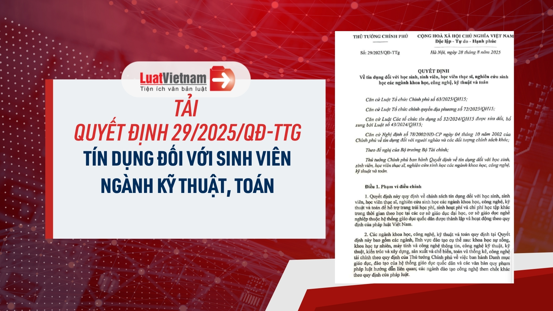 Xem chi tiết tại đây: Quyết định số 29/2025/QĐ-TTg ngày 28-8-2025 của Chính phủ về tín dụng đối với học sinh, sinh viên, học viên thạc sĩ, nghiên cứu sinh học các ngành khoa học, công nghệ, kỹ thuật và toán