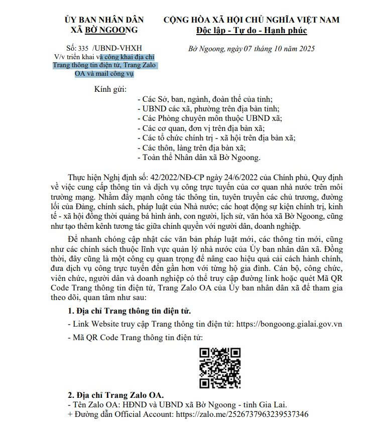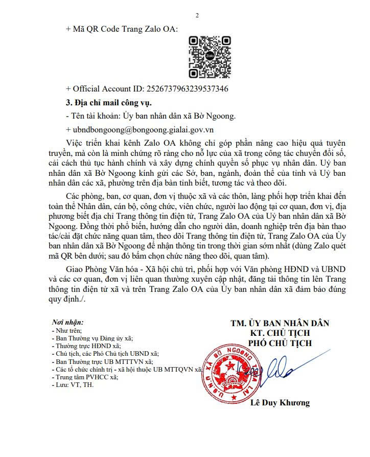 Truy cập chi tiết tại đây: Công khai địa chỉ Trang thông tin điện tử, Trang Zalo OA và mail công vụ xã Bờ Ngoong - tỉnh Gia Lai
