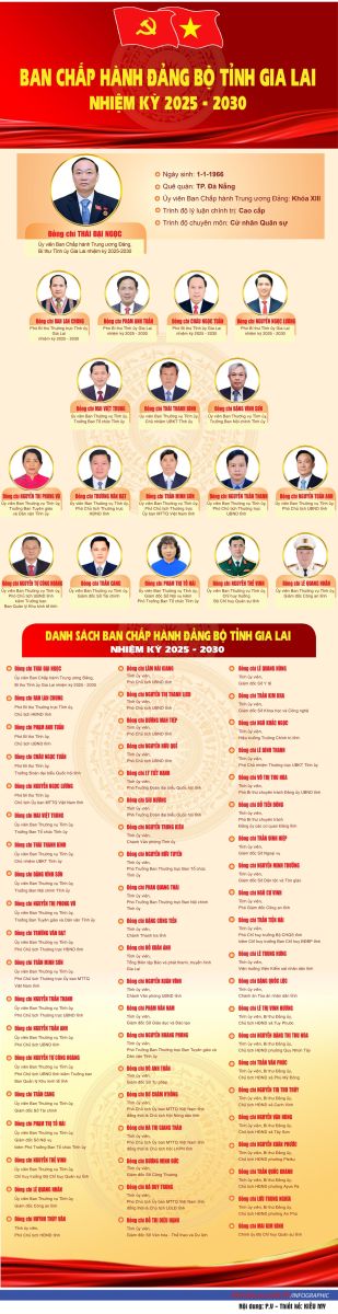Thứ sáu, 03/10/2025 | 12:58 A- A A+ | Danh sách Ban Chấp hành Đảng bộ tỉnh Gia Lai nhiệm kỳ 2025-2030 Chia sẻ Đọc bài Lưu Danh sách Ban Chấp hành Đảng bộ tỉnh Gia Lai nhiệm kỳ 2025-2030Nguồn: Cổng thông tin điện tử tỉnh Gia Lai. Từ khóa: Danh sách Ban Chấp hành Đảng bộ tỉnh Gia Lai nhiệm kỳ 2025-2030