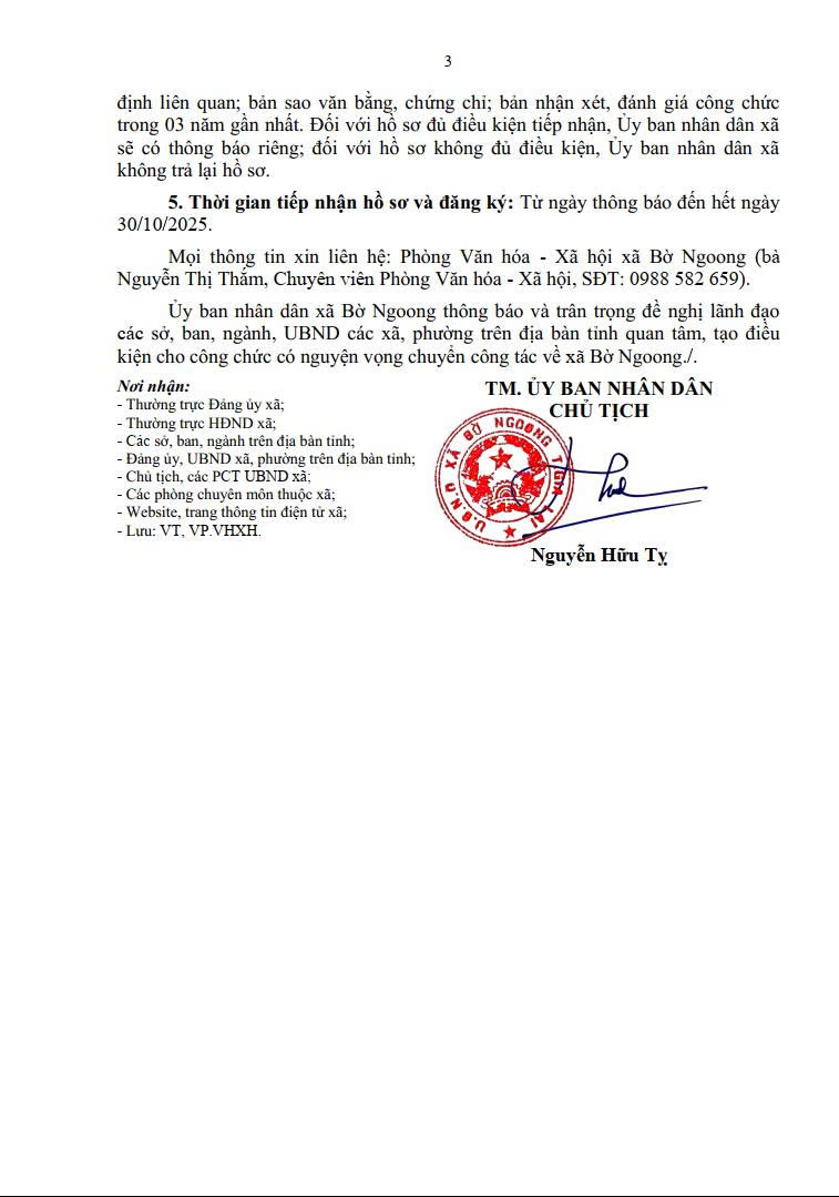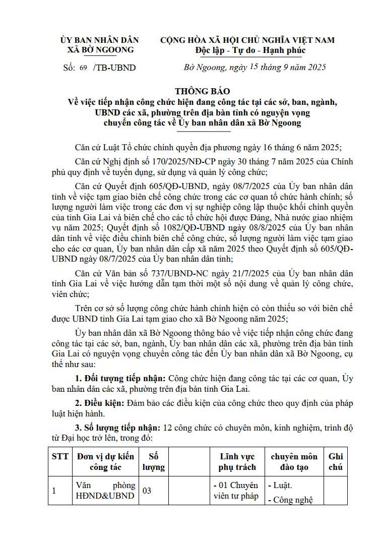 Thứ năm, 18/09/2025 | 10:16 A- A A+ | Thông báo tiếp nhận công chức có nguyện vọng chuyển công tác về Ủy ban nhân dân xã Bờ Ngoong Chia sẻ Đọc bài Lưu Xem chi tiết tại: THÔNG BÁO TIẾP NHẬN CÔNG CHỨC TỪ ĐỊA PHƯƠNG KHÁC VỀ XÃ BỜ NGOONG Nguồn: Ủy ban nhân dân xã Bờ Ngoong. Từ khóa: Thông báo tiếp nhận công chức có nguyện vọng chuyển công tác về Ủy ban nhân dân xã Bờ Ngoong