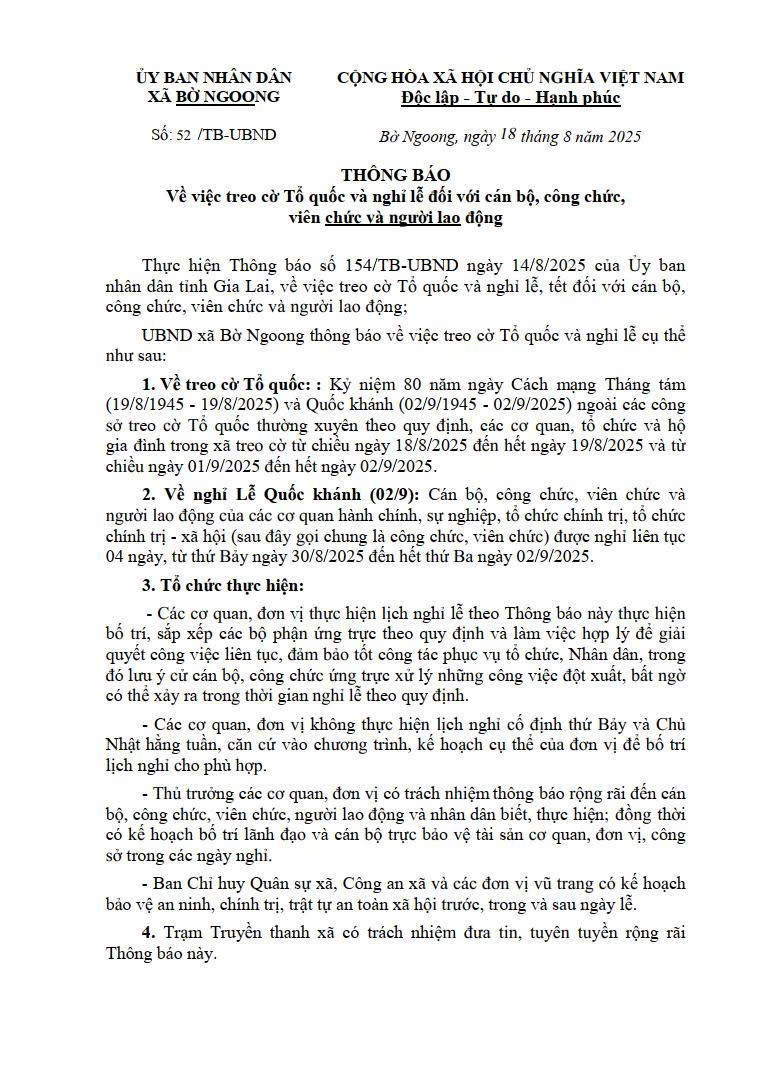 UBND xã Bờ Ngoong thông báo về việc treo cờ Tổ quốc và nghỉ lễ cụ thể như sau: